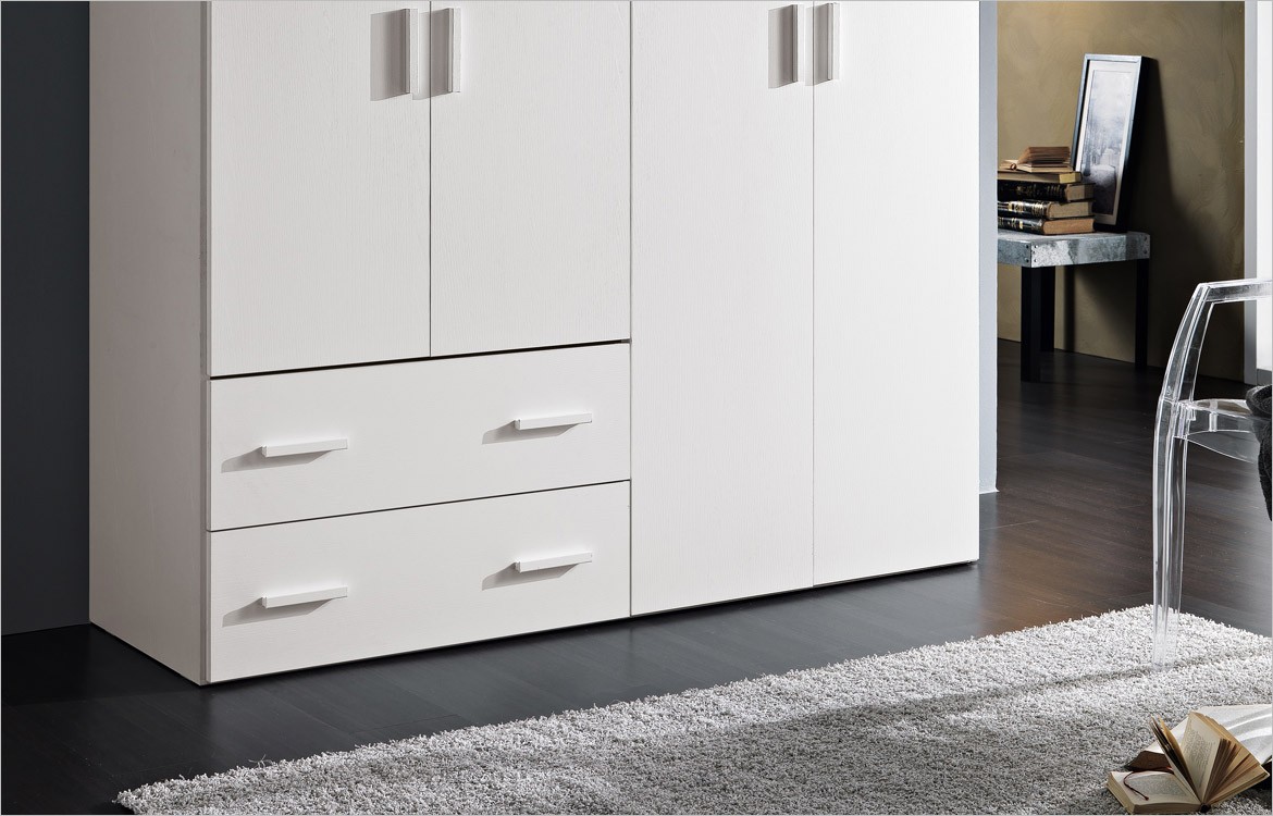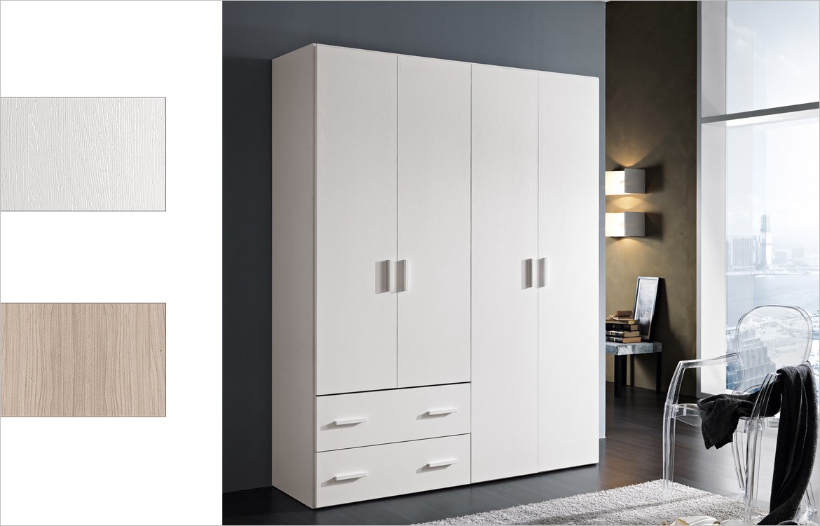 • Armadio multiuso 4 ante battenti e due cassetti, 2 ripiani interni inclusi.