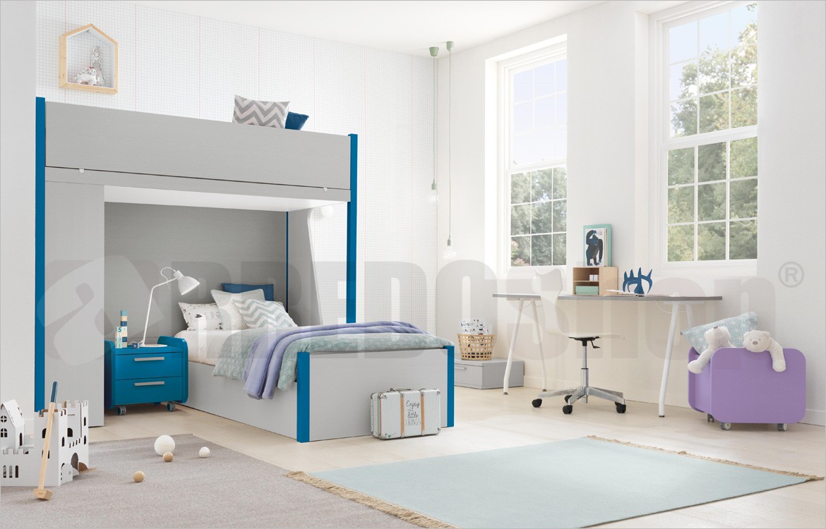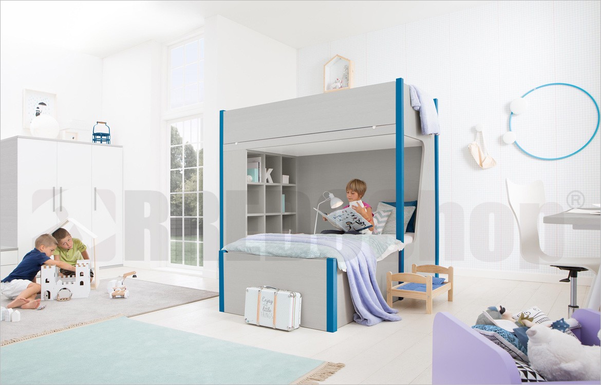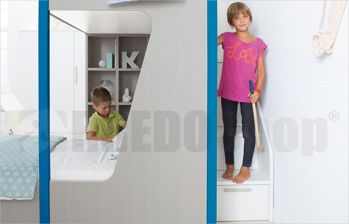 -Letto a castello HAPPY a "elle" con libreria e protezione misure: L.213 P.213 H.189