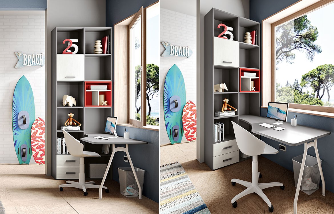 - Zona studio formata doppia libreria con vani a giorno, anta e cassetti