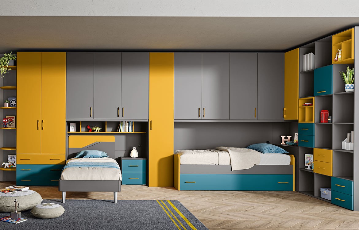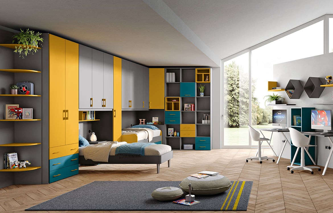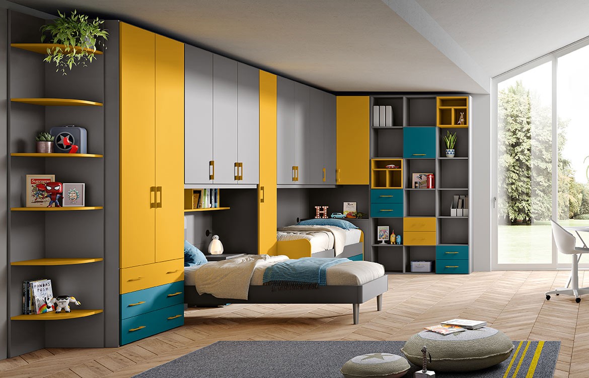 - Struttura armadio con ponte lineare e ponte angolare con librerie, ante, cassetti