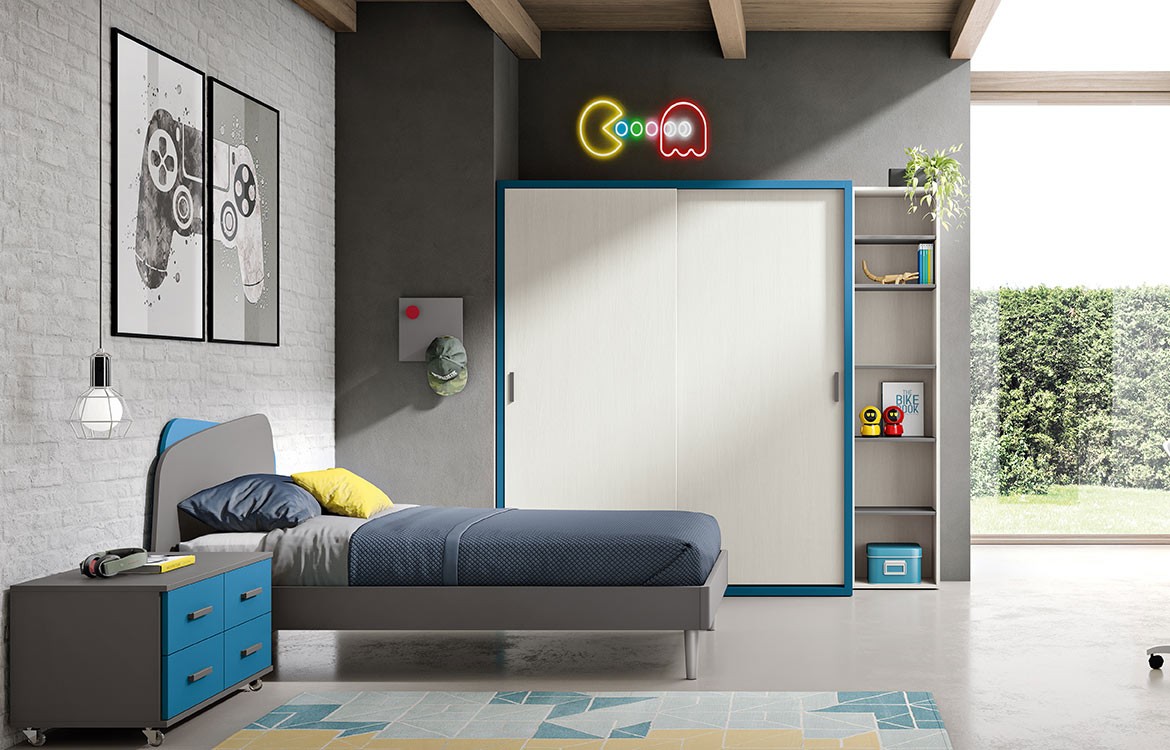 - Composizione armadio anta scorrevole e libreria con vani a giorno,