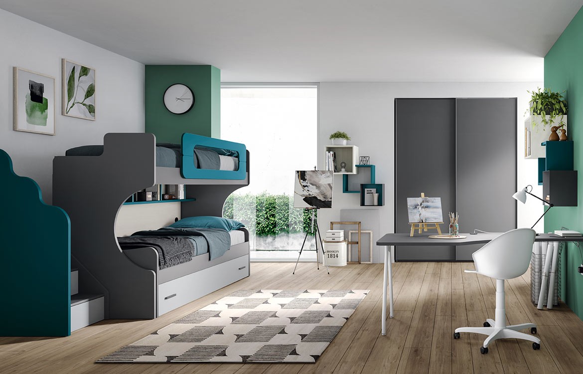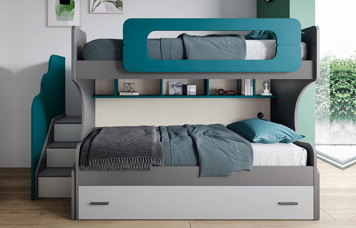 - Letto a Castello con tre letti, con libreria sottoponte e sponda di protezione