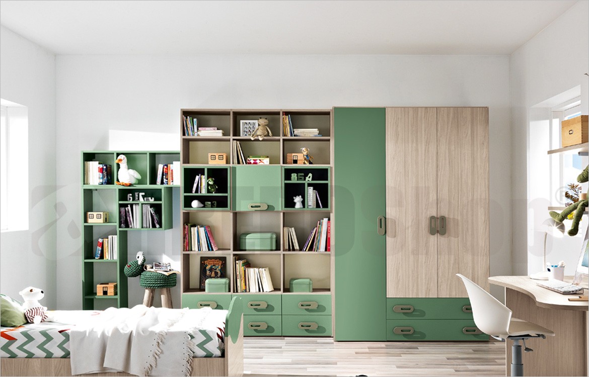 - Composizione libreria a tre colonne con 6 cassetti e vani a giorno