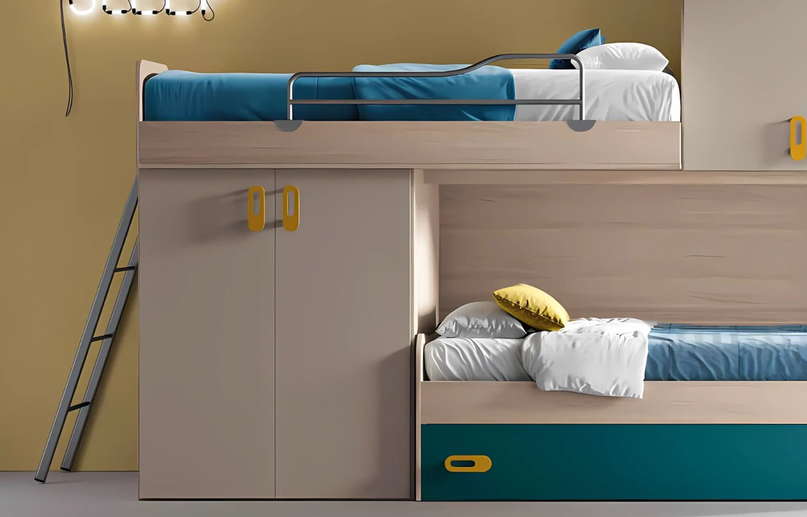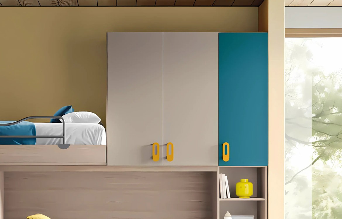 - Struttura con armadio a soppalco con 5 ante e colonna, con vani a giorni e cassetti