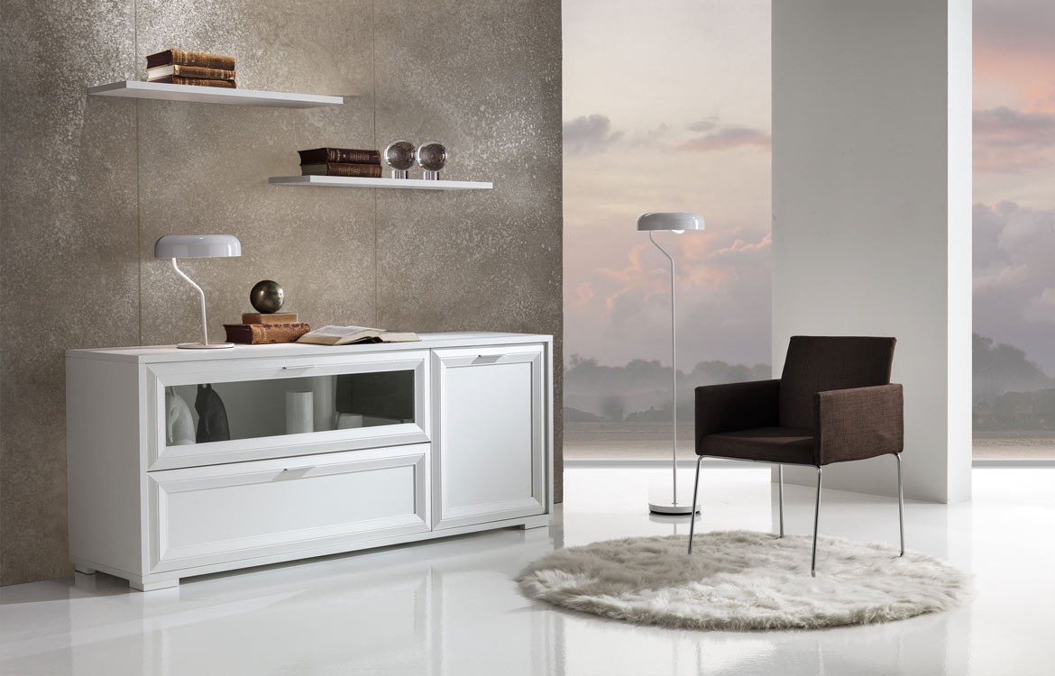 -Madia in Decò con anta, anta a ribalta in vetro e cestone, misure: L.185 - H.80 - P.52,5