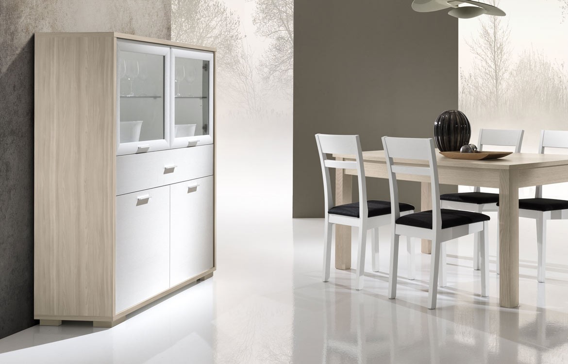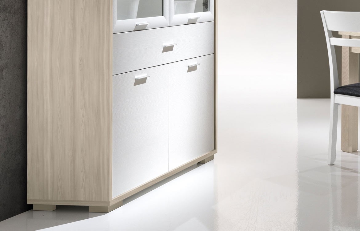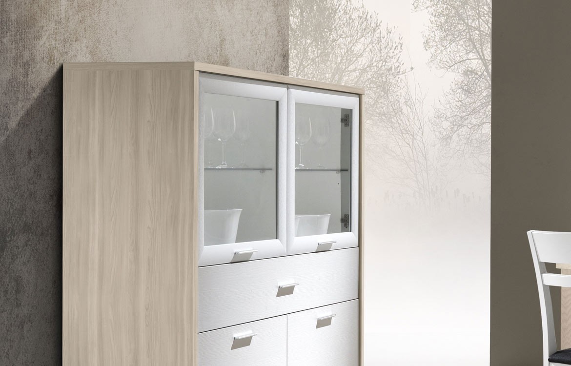 -Madia con 2 ante in vetro, 2 ante in legno e cassetto, misure: L.125 - H.150 - P.42,5