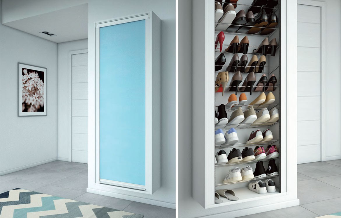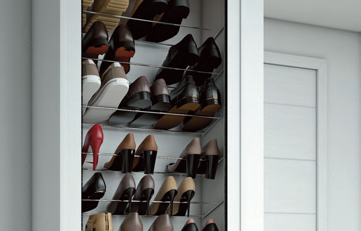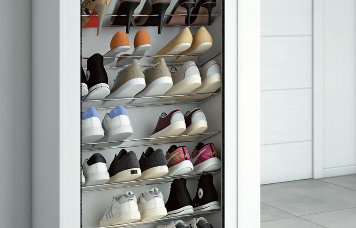 Scarpiera con struttura in legno rivestito melaminico bianco.