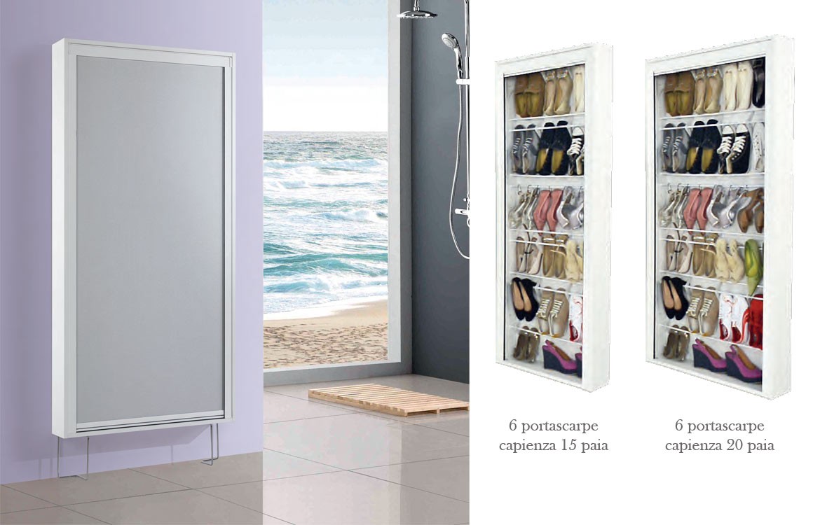 Scarpiera con struttura in legno rivestito melaminico bianco, telo verticale (avvolgimento automatico) su guide in alluminio bianco. Capacità 22 paia.