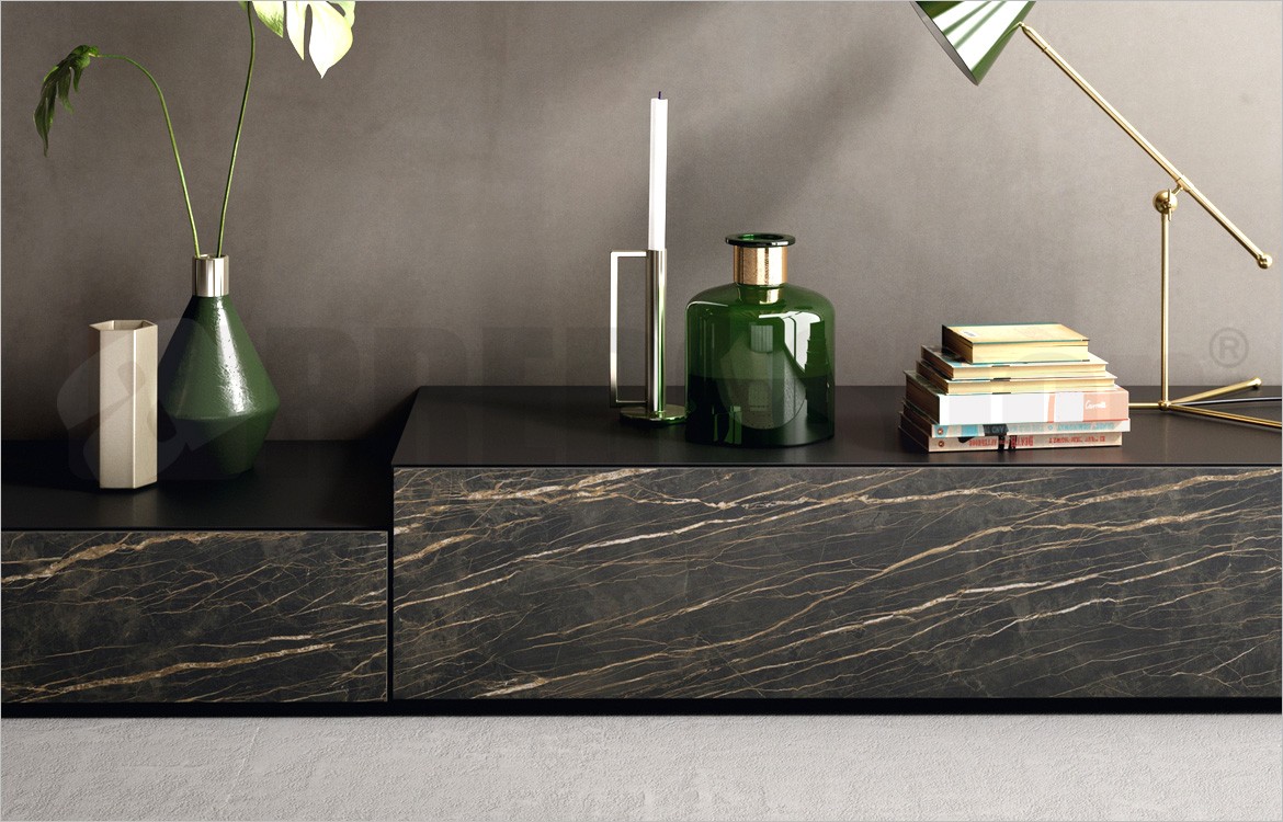 Finiture: Laccato Nero Opaco / Laccato metallizzato ottone / Laminam bianco statuario / Vetro