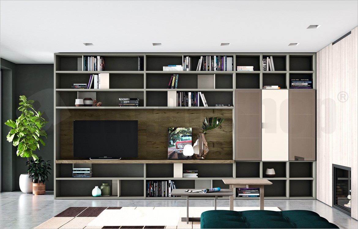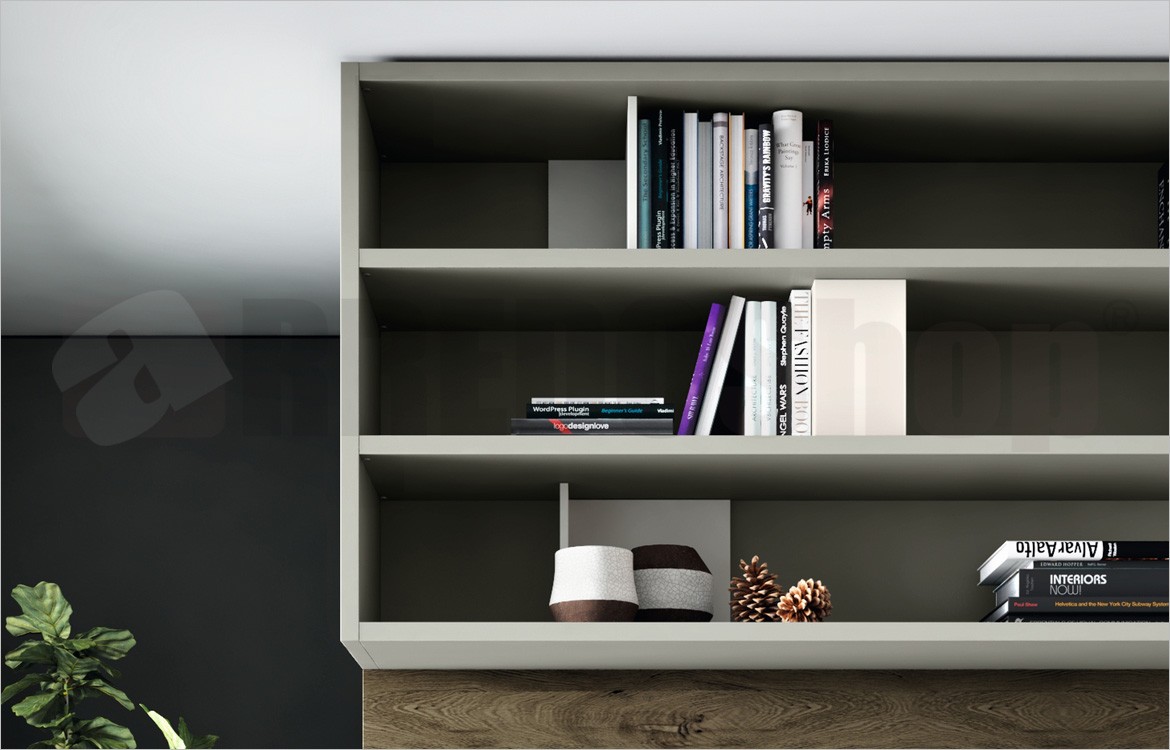 -Parete attrezzata con vani a giorno L438 x P37 x H243,6 Lacc. cenere opaco