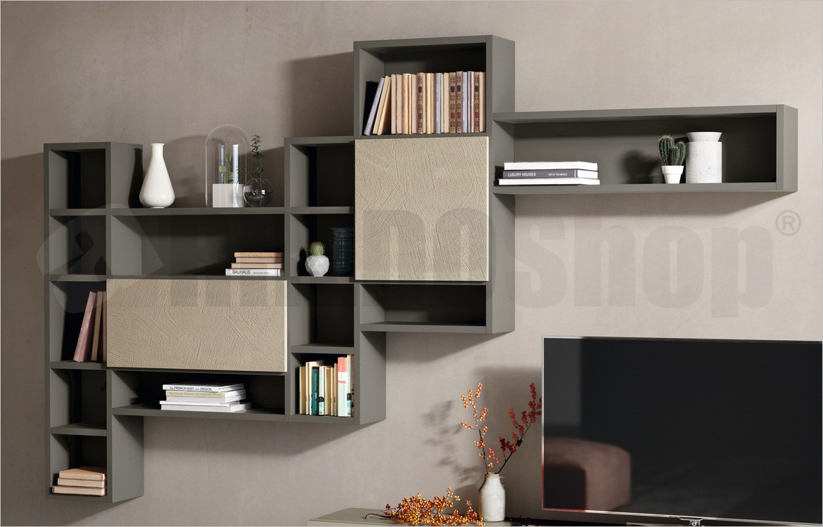 -Composizione libreria pensile con vani a giorno con schiene Lacc. grigio quarzo opaco