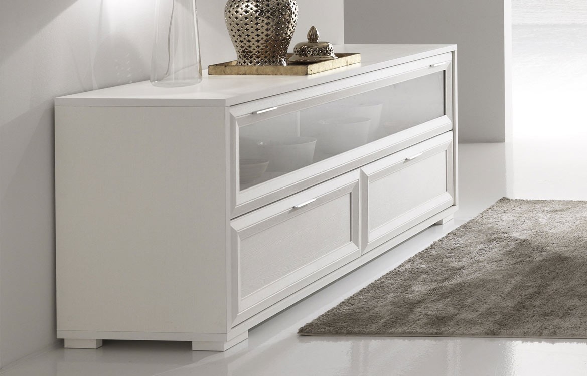 -Madia in Decò con anta in vetro a ribalta e cassetti, misure: L.185 - H.80 - P.52,5