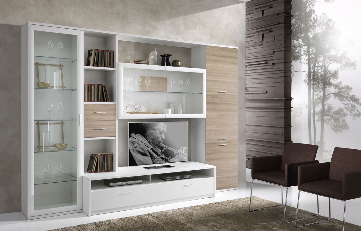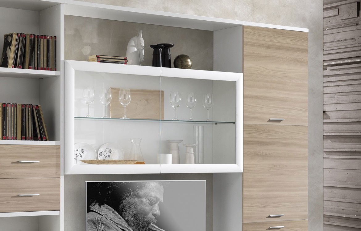 Composizione zona giorno JAZZ 081 con base 2 cassetti e vani a giorno, colonna anta in vetro, colonna ante in legno e vetrina.