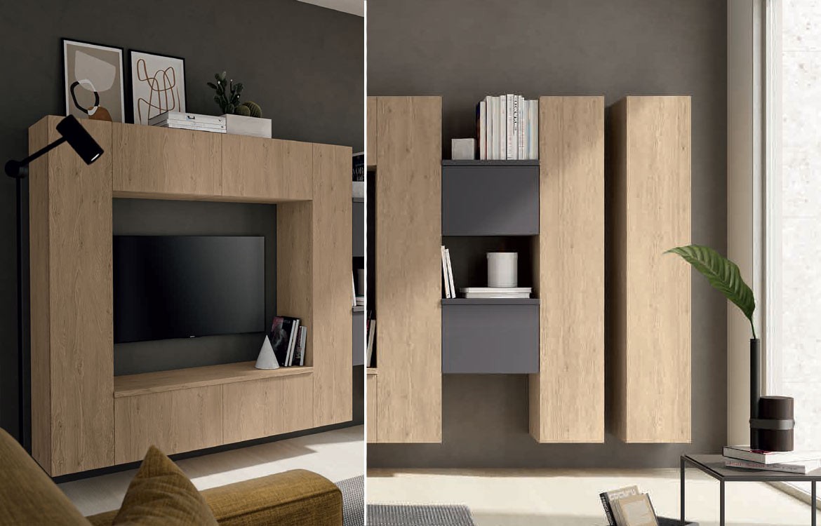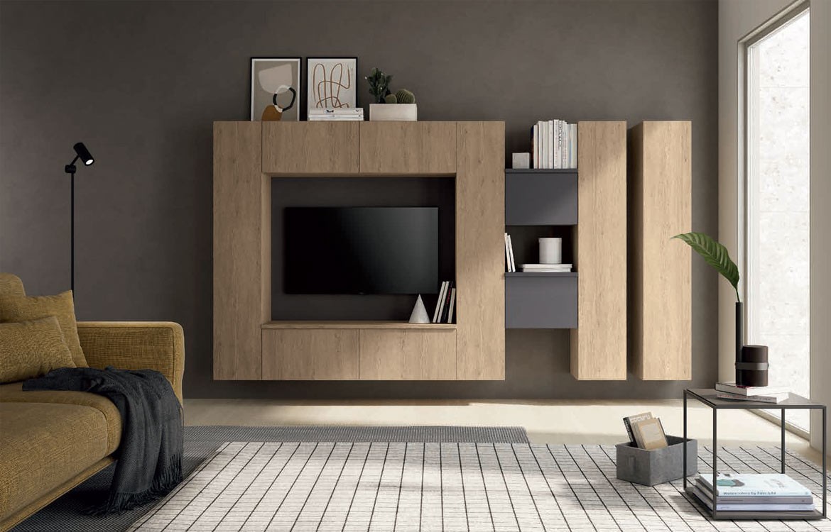 Mobile zona giorno con componibili sospesi porta TV, pensili con anta e pannelli attrezzati.